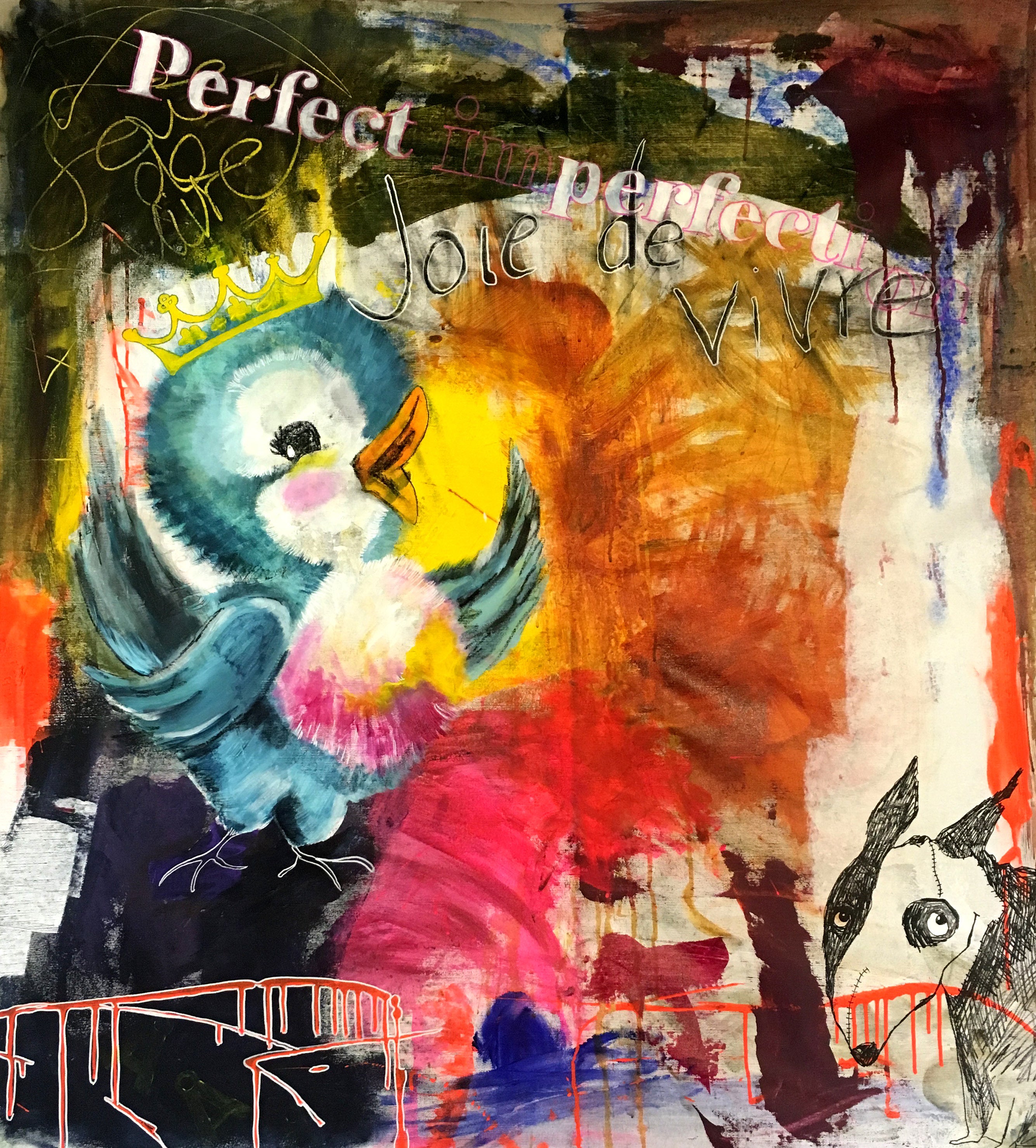 The vintage bird is chirping in a jumble of colours. Life is wonderful. Wonderful, wonderful, wonderful. The mischievous dog by Tim Burton interrupts, it wants to join in as well. Contrasts and Perfect Imperfection.