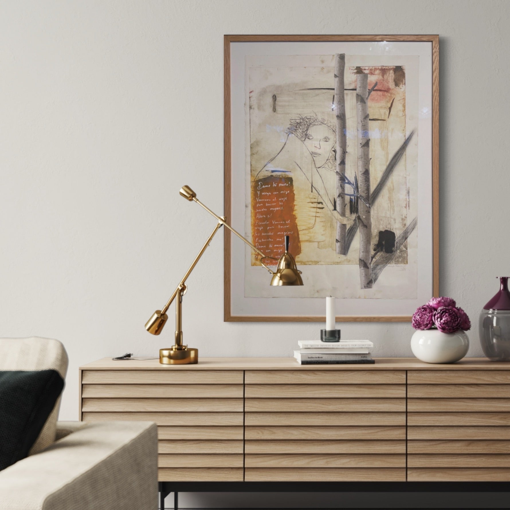 Framed in a standard light oak frame, which is included free of charge.