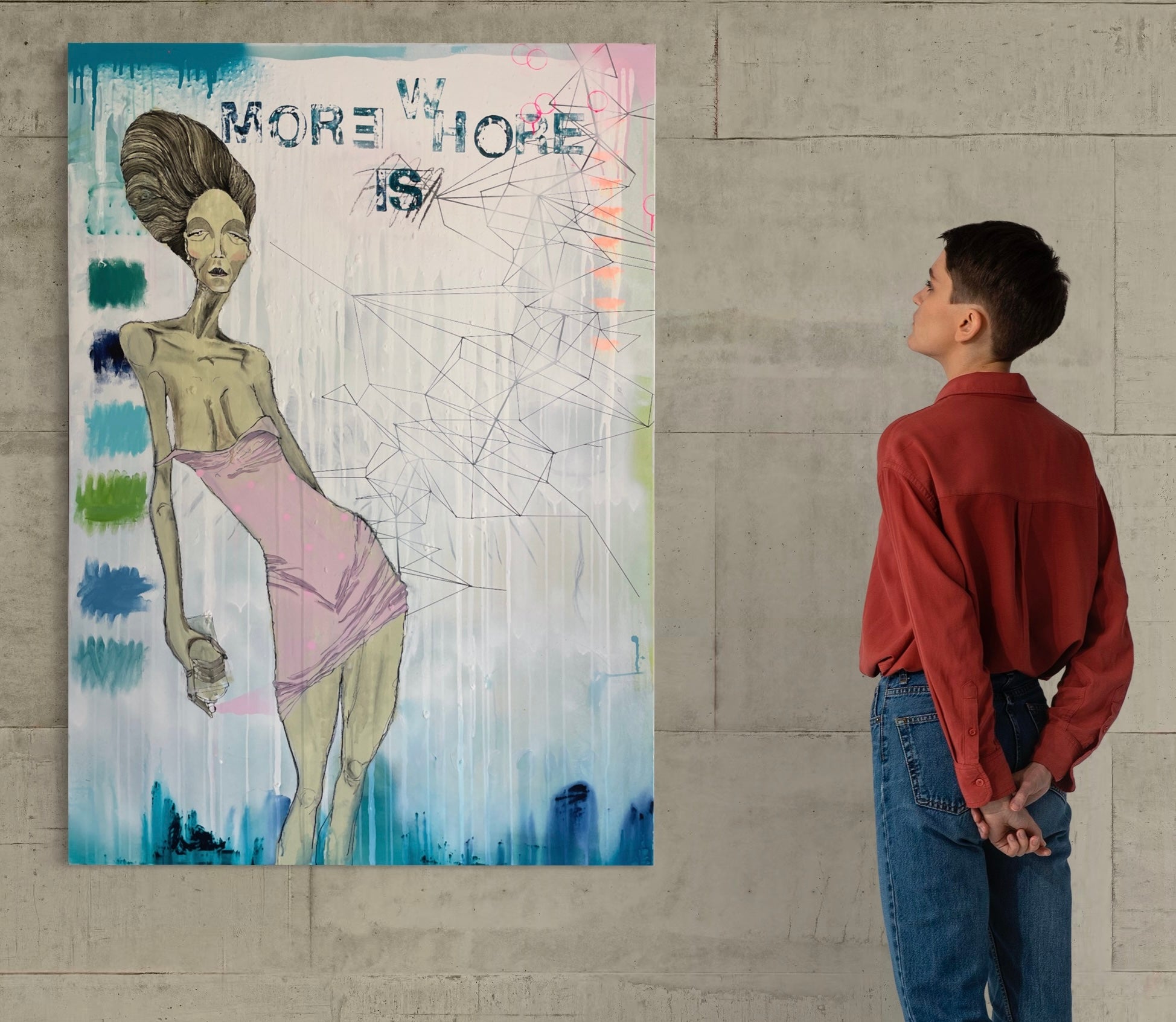 Grungy background is tightened by clean, geometric lines and boxes. And in her hand she lightly presses the spray can which gives her dress etc.