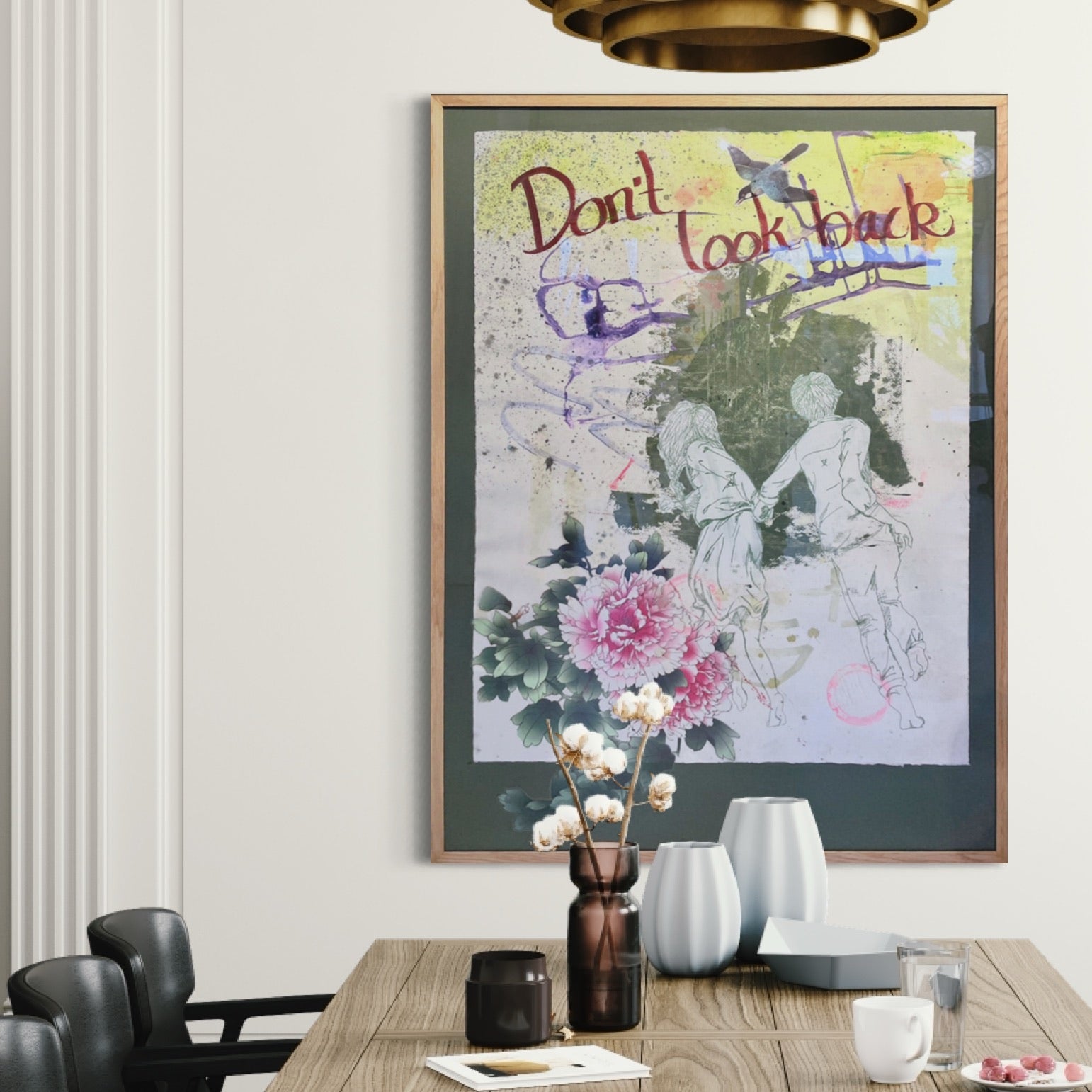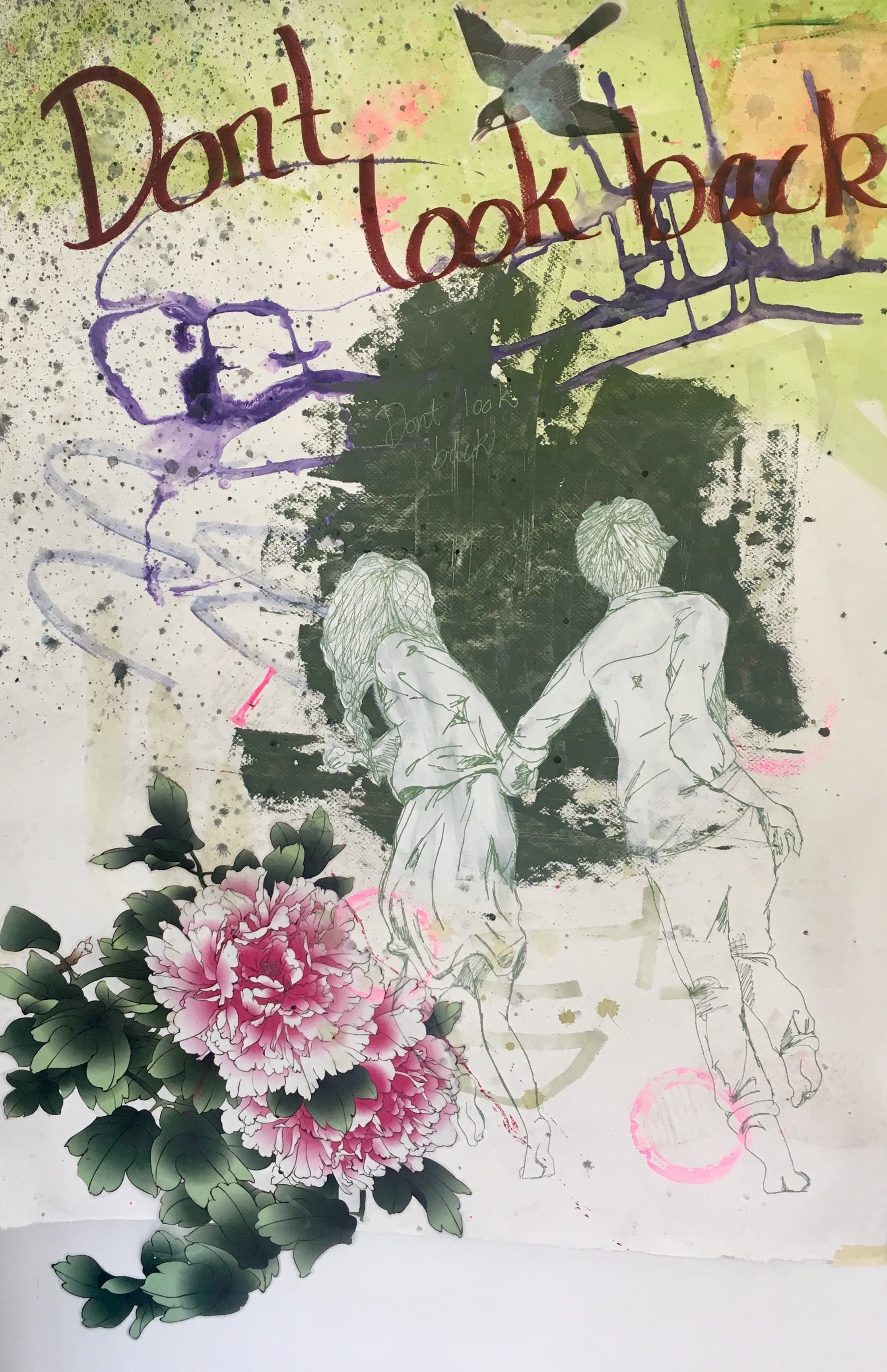 Med fandenivoldskhed, løber de to hånd i hånd mod noget nyt. Pæonerne blomstrer stort omkring dem, og er med til at bryde rammen. Fuglen vogter over dem og opfordringen i billedet er at have fokus på egen lykke. I al fald for en stund - uden at se sig tilbage.